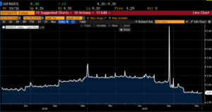 Secured Overnight Financing Rate (blue) & US Federal Reserve Interest on Reserve Balances (white), October 2024 – present